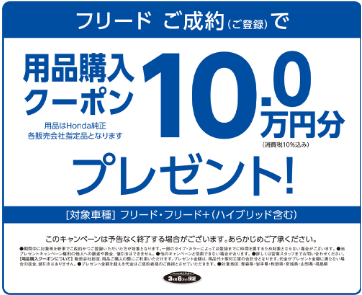 フリードご成約(ご登録)で、Honda純正用品購入クーポン10万円分プレゼント!